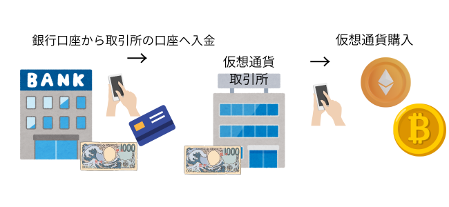 仮想通貨取引所に口座開設(※無料)をし、割り当てられた自分名義の口座へ持っている銀行口座等から入金し、仮想通貨を買う、といった流れです。基本、オンラインです。スマホでさくっとできます。(パソコンでももちろん可)